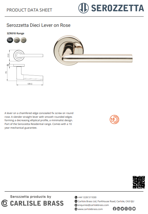 A lever on a chamfered edge concealed fix screw on round rose. A slender straight lever with smooth rounded edges forming a decreasing elliptical profile, a minimalist design. Part of the Serozzetta Residential range. Comes with a 10 year mechanical guarantee.